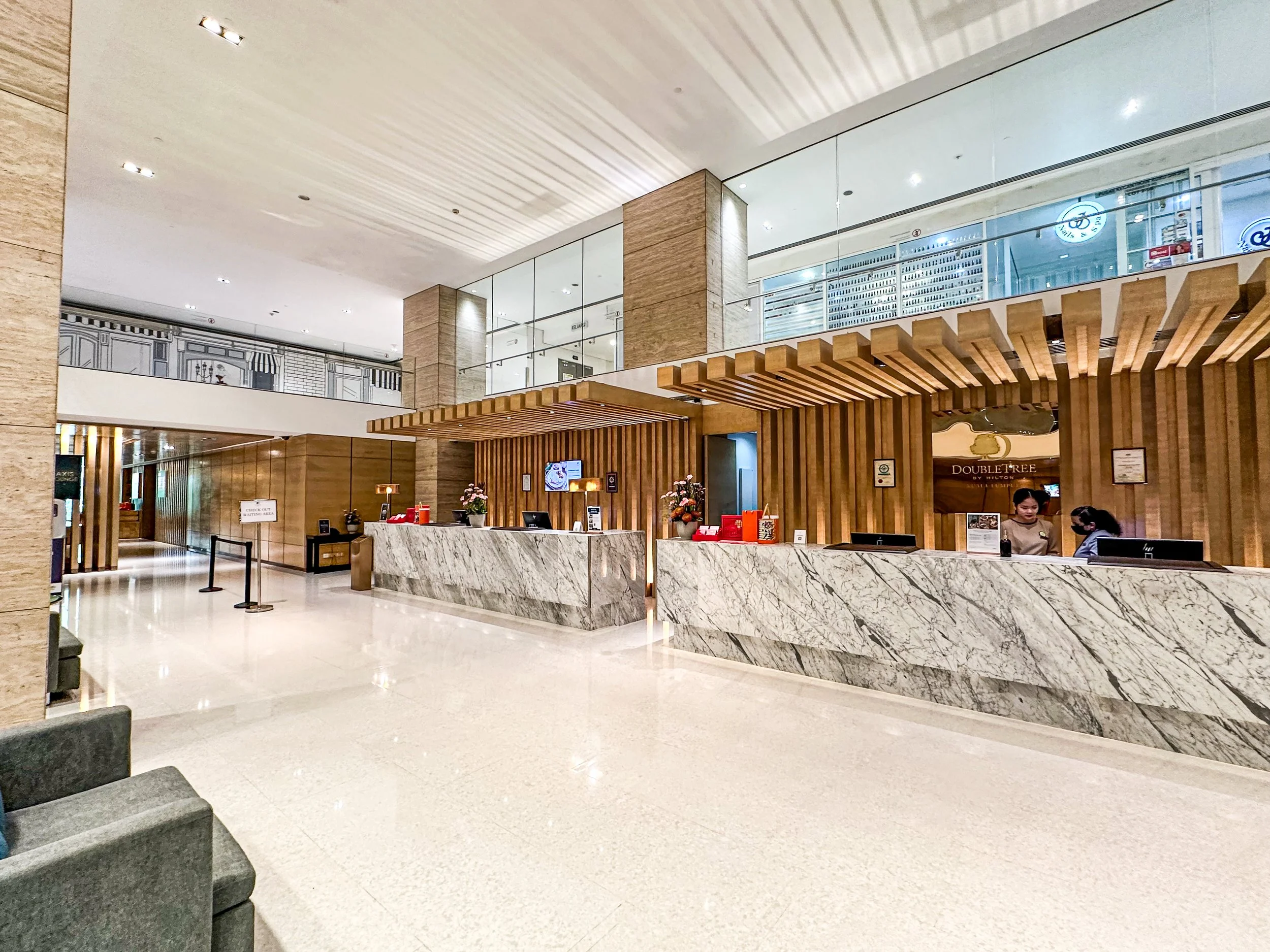 The reception area at DoubleTree by Hilton Kuala Lumpur, located on Level 2 inside Intermark Mall. After taking the escalator up to the lobby, I was greeted with a warm chocolate chip cookie—such a nice personal touch that immediately set a welcoming tone. The lobby itself is modern and comfortable, with plenty of seating and a relaxed vibe, making it feel like a quiet retreat even though it’s inside a busy mall.