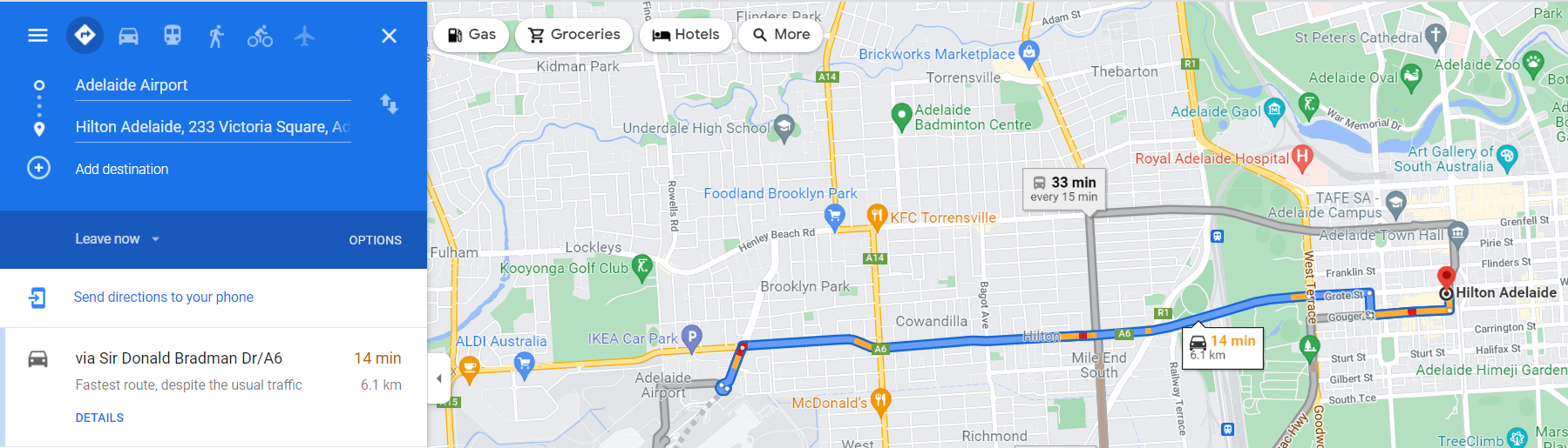 Ride-shares or Drive: Itβs about 15 - 20 Minutes Ride from Adelaide Airport (ADL) to the hotel entrance. Always give yourself some time with peak hour traffic and roadworks.